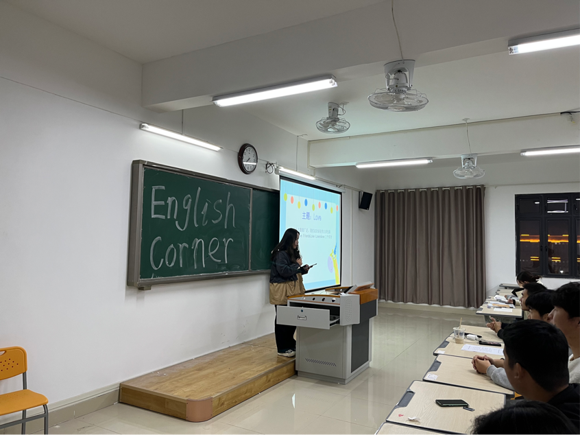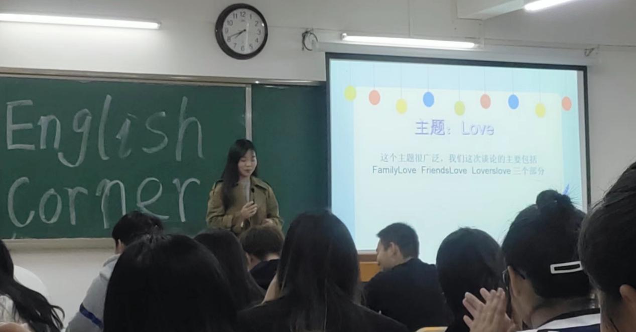 活动开始,主持人曹子义同学发言,引入本次英语角的主题“Love”,主持人也给大家共享了他的想法。接着,张莹莹同学以一首英文歌曲“Love story”大大提高了同学们的热情,为全场营造了一种活跃热闹的氛围,鼓励了更多的同学积极展现自己。随后又进行了“单词接龙”和“你说我猜”英语游戏竞赛。整场活动持续一个半小时,整个过程中,大家都沉浸在轻松和谐的气氛里。同学们不但讨论了这次的主题,谈到了如何让英语专业的活动变得更有意义,也讨论到他们各自感兴趣的话题。