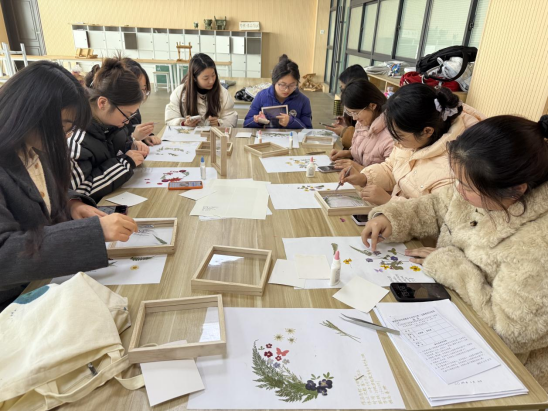 活动伊始,张晓婷老师为同学们讲解了岭南押花的历史渊源、艺术特色与制作技法,并展示了精美的押花作品。在张老师的细致指导下,同学们亲手尝试设计、摆放、固定花瓣与叶片,将一朵朵干燥的花材转化为充满诗意的作品。过程中,大家沉浸于花卉的色彩与形态之美,体会着手工创作的专注与乐趣,也感受到了非遗技艺中所蕴含的匠心与生命力。