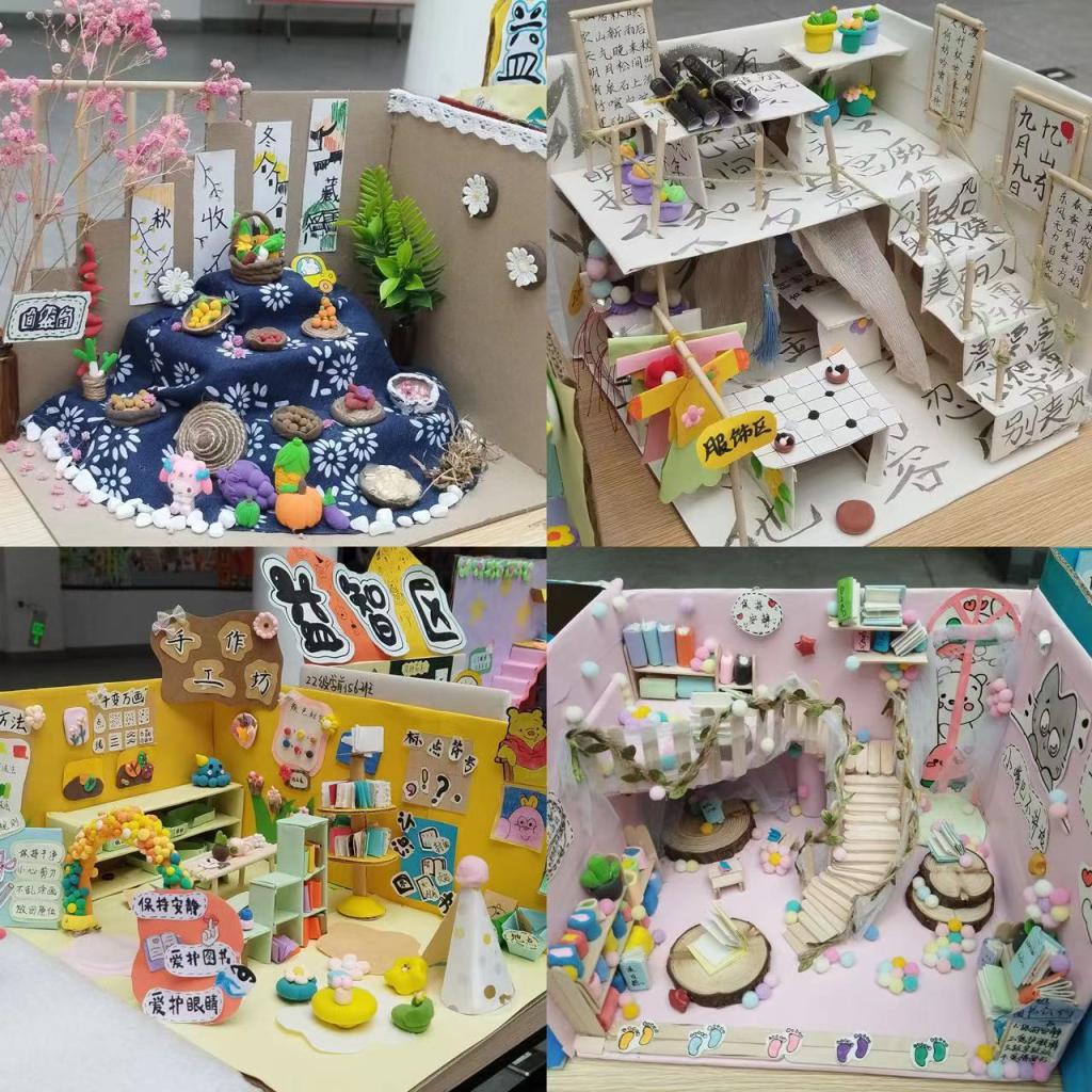 本次活动一共分为三个展区,吸引了学前教育专业数百件极具创意和实用性的作品参展。作品涵盖了幼儿园区域环境创设、墙饰设计及”玩教具“设计多个领域,展现了同学们在创新理念、手工技能和审美观念方面的独特见解。展品中有的独具匠心,将学前专业书法课程与手工技能巧妙融合,创设了多件符合中国传统元素的优秀区域设计作品;有的将中国民间工艺融入墙饰环创,展现了传统工艺的同时也提升了民间艺术的传播。
