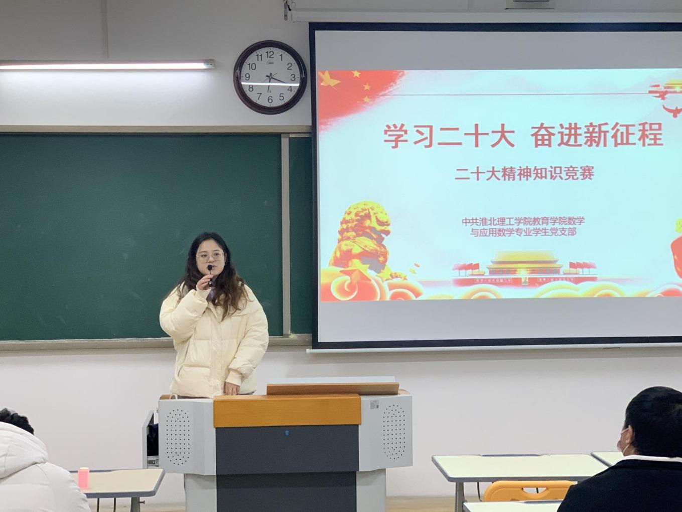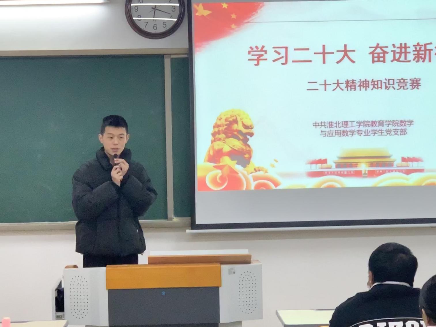 为深入学习宣传贯彻党的二十大精神,回顾党的光辉历史,推动党的二十大精神落地生根、入脑入心。伟德国际victor1946数学与应用数学学生党支部积极部署,于12月1日在1教313开展“学习党的二十大精神知识竞赛活动”,活动由支部委员孙虎主持,支部书记陈媛媛、全体支部党员及入党积极分子参加了活动。