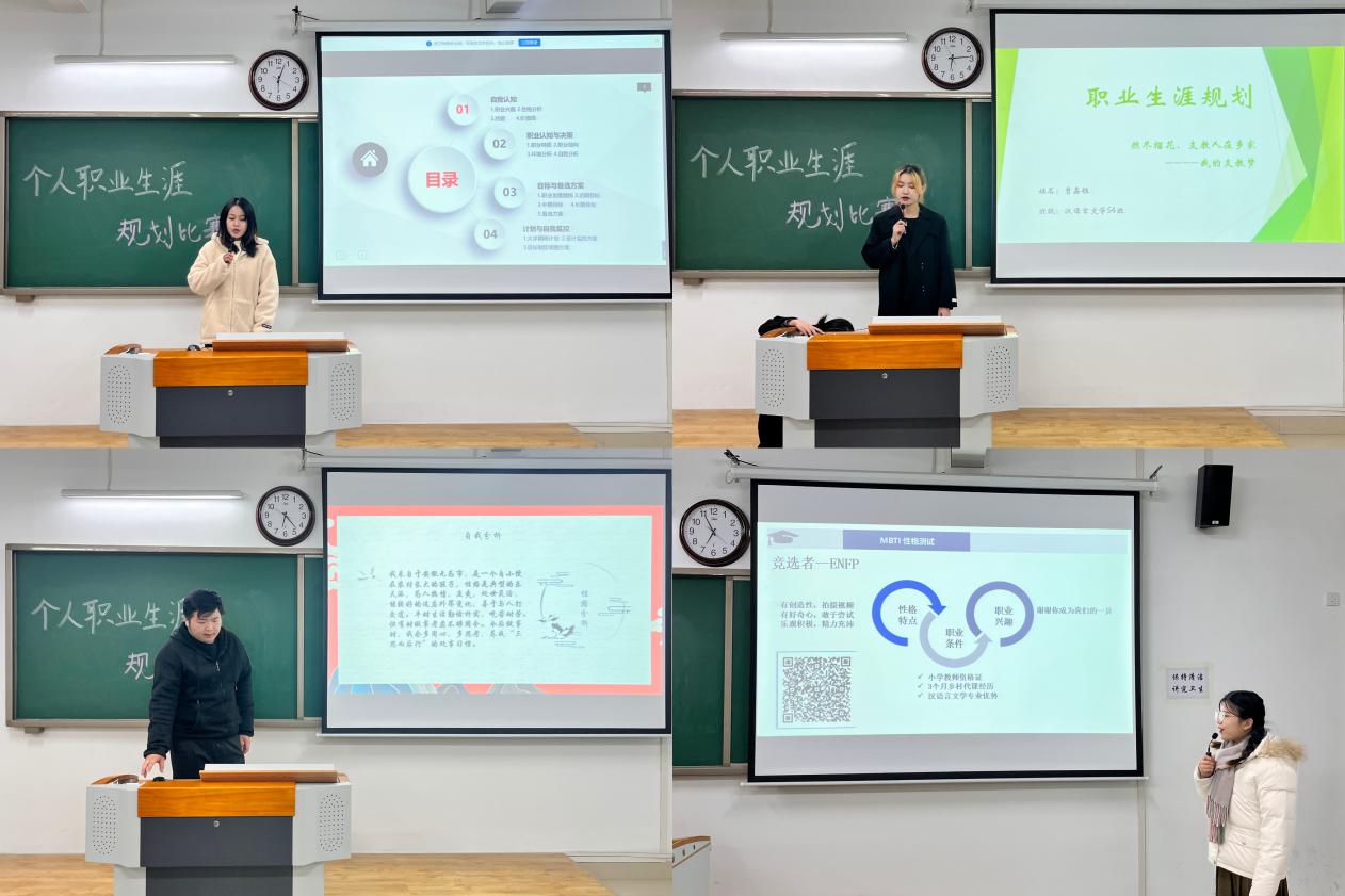 为落实立德树人根本任务,发挥“以赛促学、以赛促教”的积极作用,进一步深化大学生职业生涯规划和创新创业教育,提升大学生职业生涯规划能力,为未来职业发展奠定基础。伟德国际victor1946自10月中旬以来在全体2022级专升本学生中开展了“职业生涯规划大赛”活动,活动得到了同学们的热情支持和广泛参与,参赛项目分职业规划类和创新创意类两类,经班级初赛后,最终共28个项目进入本次院级决赛。决赛于12月2日晚在1号教学楼413、414、415、416教室分组举行,各比赛小组评委由辅导员老师担任。