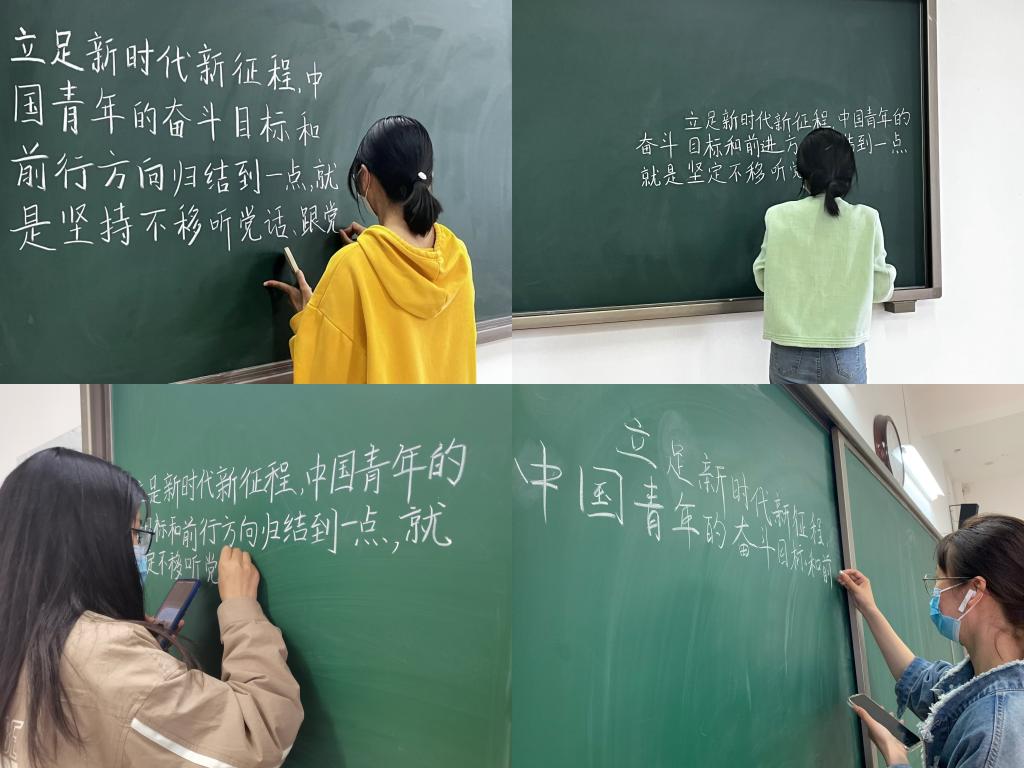 黑板粉笔书法比赛中,四位同学同时书写,一笔一画行云流水、落笔云烟,尽显学子风采,选手们讲究版面、布局排列,使作品更加大气得体。选手们表示,书写过程中,能够体会审美的愉悦,体悟难得的沉静,进而感悟汉字之美和时代精神。