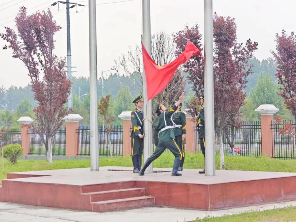 国旗护卫队迈着整齐的步伐,护送着国旗向升旗台缓缓走去,伴随着雄浑有力的国歌响起,五星红旗冉冉升起,全体师生庄严肃立,对五星红旗行注目礼。