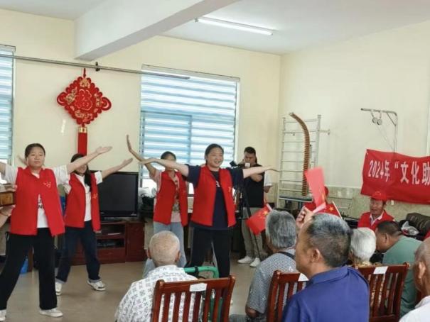 接着,志愿者们为老人们呈现了一场精彩的文艺表演,将现场气氛推向了高潮。老人们在座位上挥舞着小红旗,欢声笑语不断,共同欣赏这美妙的演出,大家都沉浸在欢乐之中。
