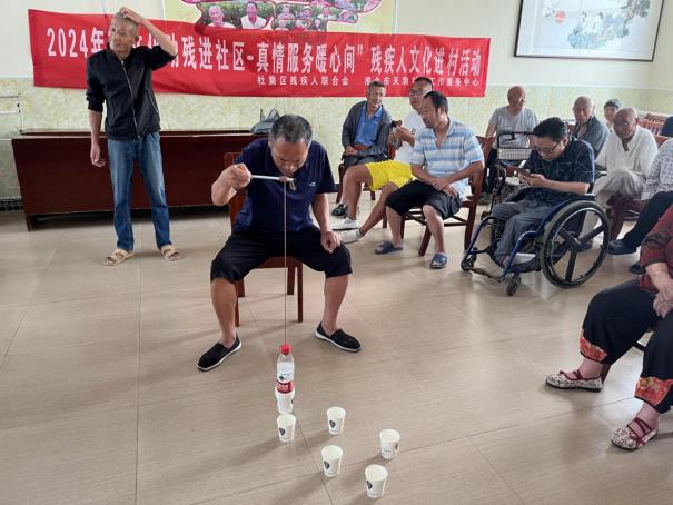 此外,志愿者们还精心组织了剪纸、“运球迷宫”“纸杯叠叠乐”和“投壶”等一系列趣味游戏。在活动室里,大家欢声笑语不断,老人们和志愿者们共同参与,共同竞技,共同享受着这段愉快的时光。这些游戏不仅锻炼了老人们的反应能力和协作精神,也为他们带来了满满的欢乐。老人们积极反馈道:“这些游戏简单又好玩,让我们都感到非常开心,真的是意犹未尽。”