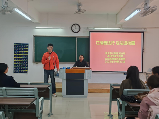 为不断深化普法教育,增强学生们的法律意识和自我保护能力,推动建成和谐、安全的校园环境。10月23日下午,伟德国际victor1946和淮北市杜集区司法局、安徽进境律师事务所携手于1教421开展“江淮普法行·送法进校园”主题活动。本次活动由伟德国际victor1946教工第二党支部书记刘畅主持,安徽进境律师事务所合伙人孟春江律师主讲,杜集区司法局普法办主任张丽丽,司法局人民参与和促进法治办主任周立业,杜集区法律援助中心主任赵义玉参与。