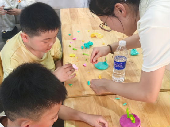 下午的课程是丰富多彩的手工粘土课。课程以向日葵为主题展开,支教团成员们引导孩子们用粘土塑造向日葵的形态,在提升小朋友们的动手能力和想象力的过程中,还结合手工作品传递了积极向上的生活态度。同时,还融入了非遗文化等相关内容,让孩子们在实践中收获非遗知识,传承红色文化。