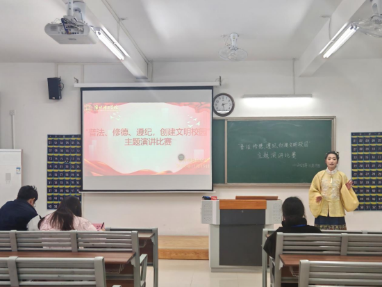 比赛现场秩序井然,选手们依次登台展现风采。他们以“普法、修德、遵纪,创建文明校园”为核心,结合校园日常与成长感悟娓娓道来,或阐述法治对青春的护航意义,或分享修德践行的细微故事,或强调纪律对校园文明的保障作用。他们语言流畅、情感真挚,时而慷慨激昂,时而温和恳切,精彩的表现多次点燃现场氛围,也让“普法、修德、遵纪”的种子在每位观众的心底悄然扎根。