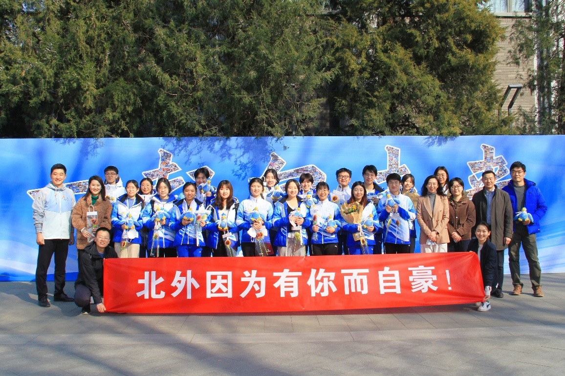 38日下午,我院首批首钢滑雪大跳台冬奥师生志愿者圆满完成北京2022年冬奥会志愿服务任务,从隔离地点平安返校。学院党总支书记张效民老师、辅导员钱梦婷老师、辅导员张翊老师及同学们早早等候在东校区文化广场,热烈欢迎志愿者们凯旋。